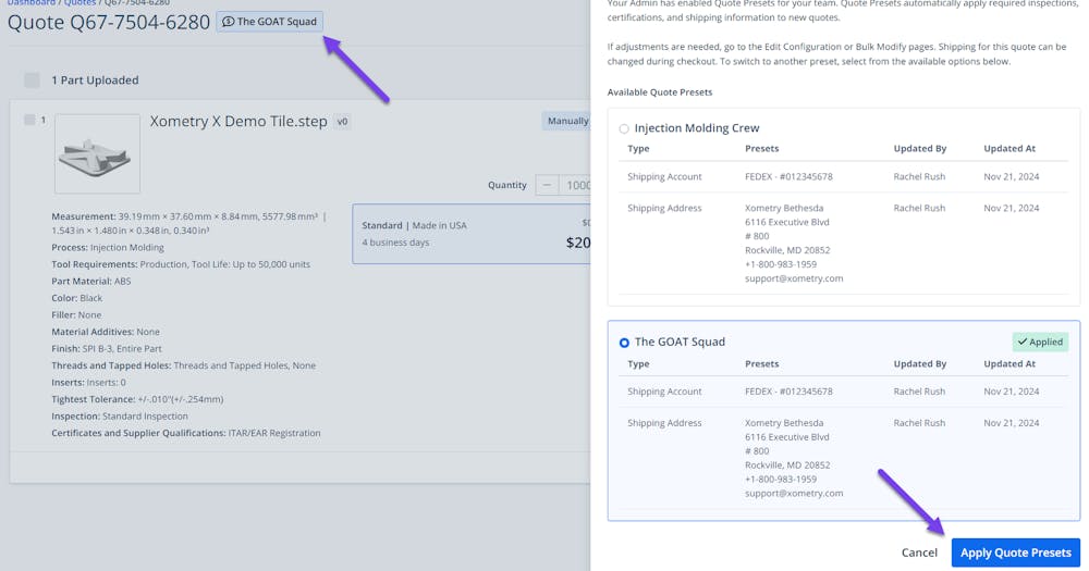 When a preset is applied, the team name will be displayed in the upper left of the quote summary screen, next to the quote id number. Clicking the team name will open a right-side panel, which lets users select other team shipping presets if the quote happens to be shared among multiple teams.